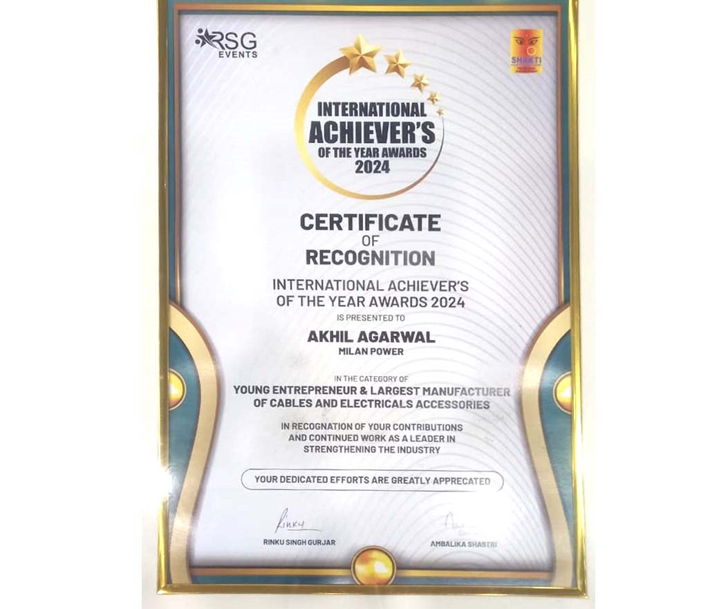 Akhil agarwal director Milan Power Jaipur company received the International Achiever of the Year Award 2024. This award was given to Mr. Akhil agarwal director Milan Power co. by film actress Amrita Rao.